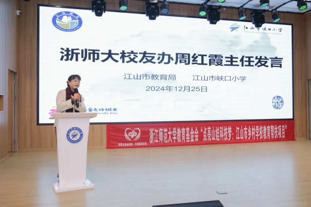 会上,浙江师范大学教育基金会秘书长周红霞介绍“点亮山娃科技梦:江山市乡村学校教育帮扶项目”的基本概况。一是捐赠科普图书来营造读好书,好读书,读书好的氛围;二是捐赠科学教具,开展科普活动、科教培训,构建创新实践课程来激发山村儿童的科技梦想;三是邀请来我们儿童文学作家、浙师大校友吴洲星来做读书的经验交流和分享。