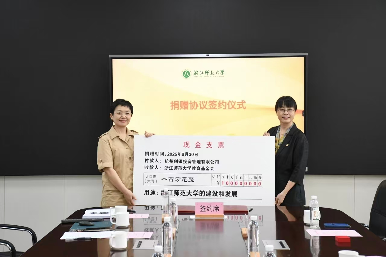 周红霞代表浙江师范大学教育基金会与杭州创银投资管理有限公司签署捐赠协议,并颁发捐赠证书、授予捐赠铭牌。