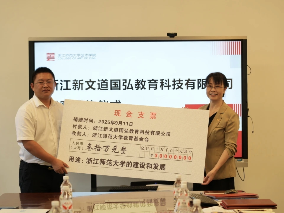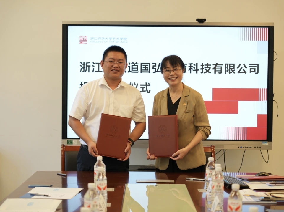 9月11日上午,浙江师范大学艺术学院与浙江新文道国弘教育科技有限公司举行捐赠签约仪式。浙江新文道国弘教育科技有限公司董事长杜长富、总经理汪洲等企业代表,浙江师范大学发展联络办公室主任、教育基金会副理事长周红霞、艺术学院党委书记王建阳等校院领导及相关工作人员出席捐赠签约仪式。双方携手为艺术学院学子成长赋能,共探校企合作育人新路径。