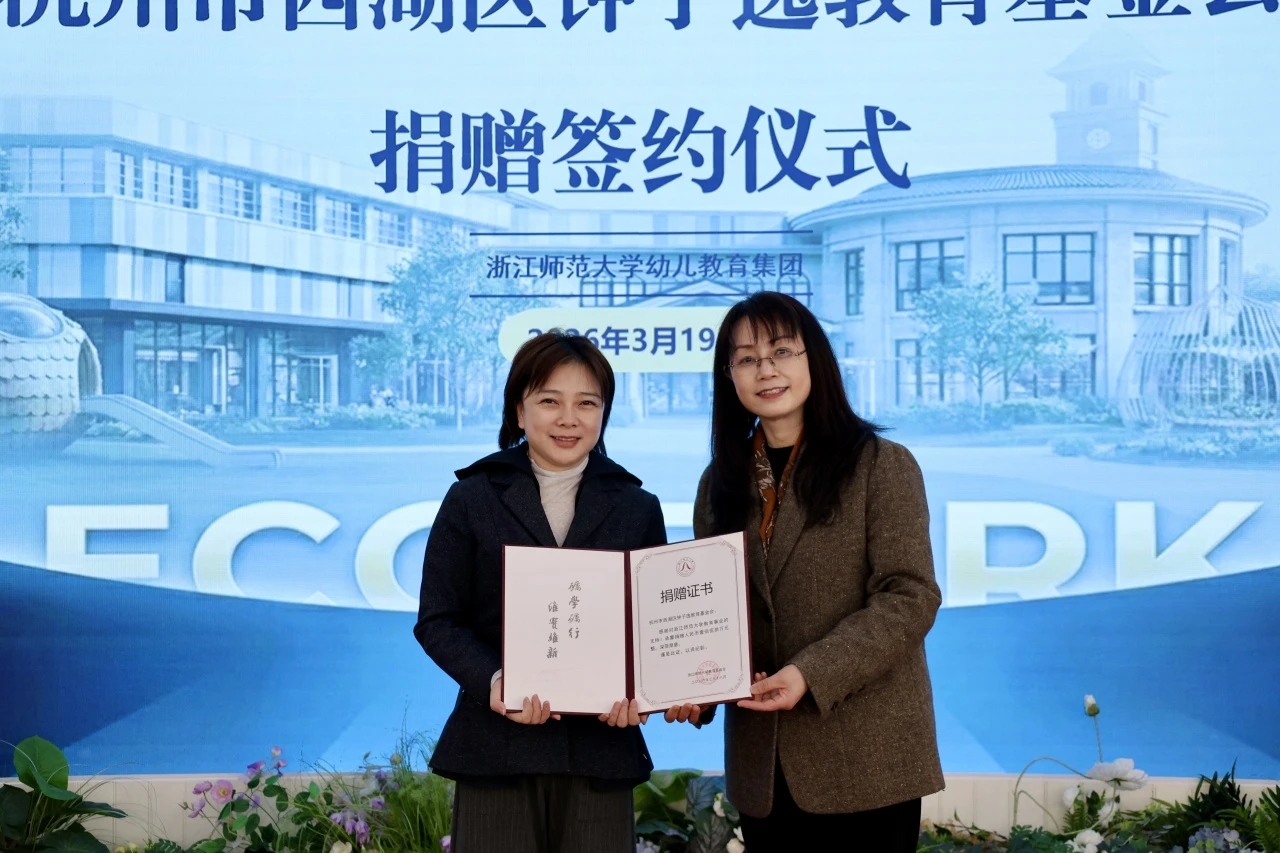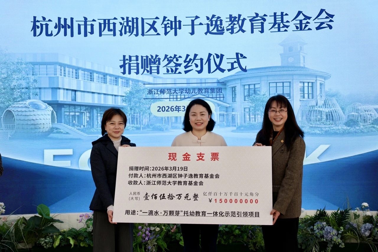 3月19日,在浙江师范大学建校70周年即将来临之际,杭州市西湖区钟子逸教育基金会捐赠签约仪式在浙师大幼教集团举行。钟子逸教育基金会向浙江师范大学捐赠150万元,用于“一滴水·万颗芽”示范引领项目,助力打造托幼教育一体化的资源高地、人才摇篮与指导交流中心,推动优质教育资源惠及更多儿童。