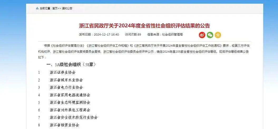 2024年12月17日,《浙江省民政厅关于2024年度全省性社会组织评估结果的公告》正式发布,经过一系列严谨的评估流程——包括社会组织自评、第三方评估机构实地现场考察和初评、省社会组织评估复核委员会复核以及浙江省社会组织评估委员会终评、媒体公示等程序,我校校友会以优异的成绩获评浙江省“5A级社会组织”,这是继2018年校友会首次获评5A之后再次获得此殊荣,该等级是浙江省社会组织的最高等级认证。