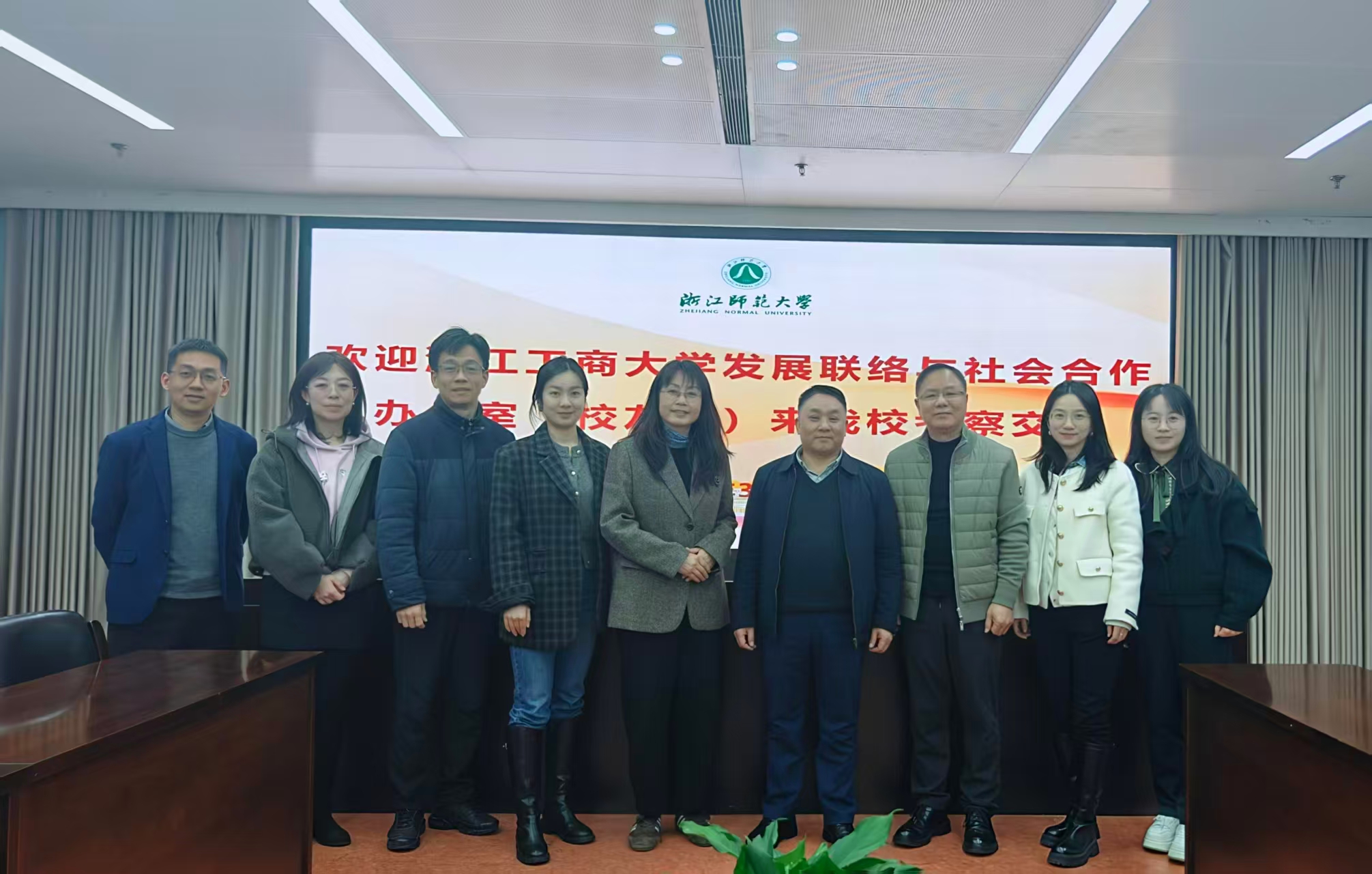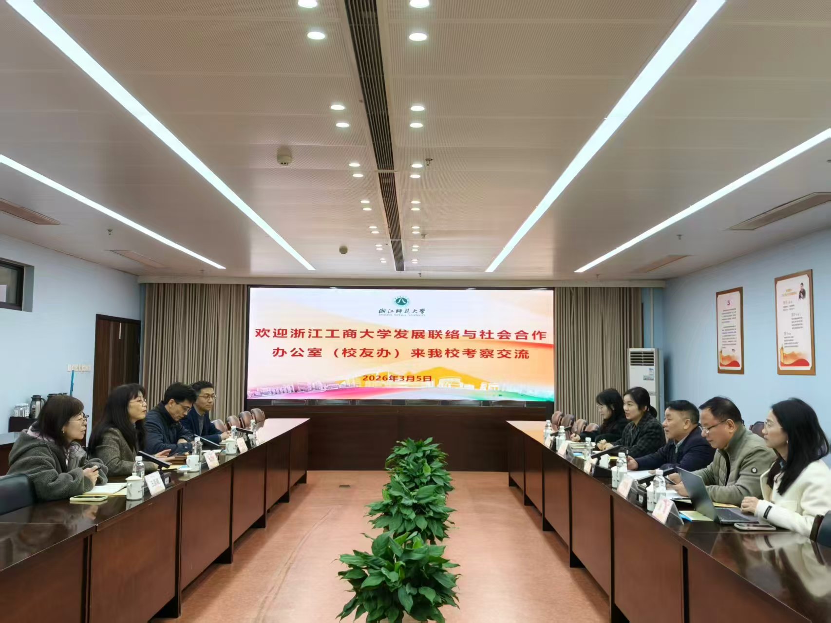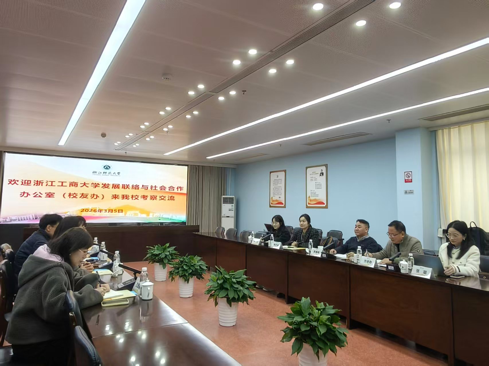 2026年3月5日下午,浙江工商大学发展联络与社会合作办公室(校友办)一行五人在罗德明主任的带领下,赴我校考察交流校友会和基金会工作。浙师大发展联络办公室主任周红霞热情接待了来访嘉宾,并在行政中心北楼202会议室举行座谈。